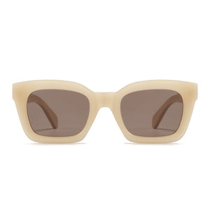 These popular 90s inspired sunglasses are a mid-sized style that will suit most face shapes and sizes. Our Zahra sunglasses are finished in a flattering cream tone and fitted with white maple wood arms.